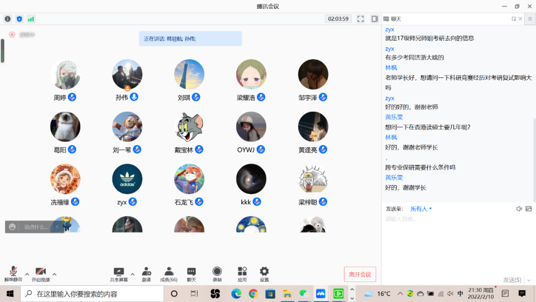 2月10日,拉斯维加斯官网在线举行了2019级本科生升学深造动员暨经验分享交流会,黄逢亮(保研本校)、周轶童(考研同济大学)、韩易航(跨专业考研北京大学汇丰商学院)、戴宝林(留学香港理工大学)、刘琪(保研清华大学)等5位往届读研的优秀学长受邀前来,倾情分享升学深造经验,为学弟学妹们的深造之路提供参考。分享会由青年教师专职辅导员孙伟助理教授主持。
