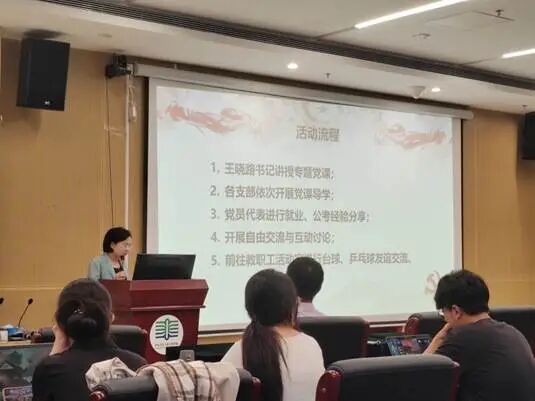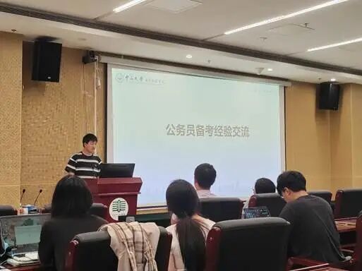 导学环节后,基础设施运维研究生党支部张奕杭同志结合自身经历开展了公务员考试备考经验分享。他从岗位选择与考试规划、公共基础知识复习策略、申论与行测答题技巧等方面进行分享,提醒大家要注重学习方法、合理安排时间、平衡好科研与职业发展规划。