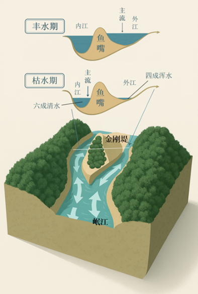 ▲都江堰鱼嘴“四六分水”示意图