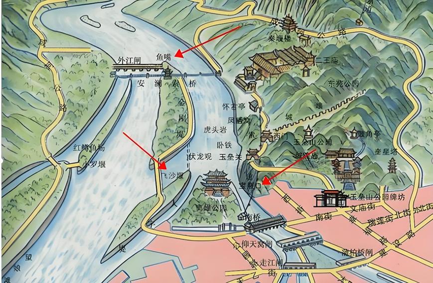 ▲都江堰三大主体工程位置图