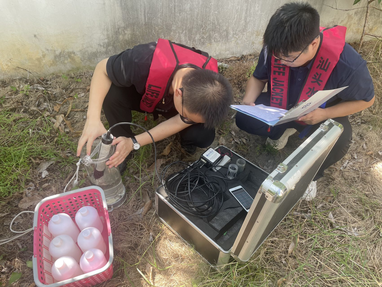 ▲赖荣标(右者)与汕头水文分局同事在雷岭镇开展水质检测