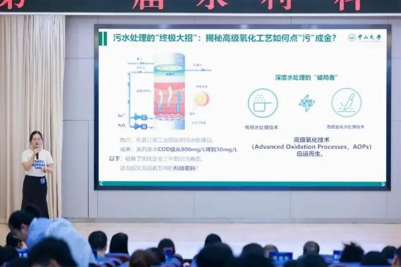 李洁莲同学自主命题演讲了《高级氧化技术:水质安全的“终极卫士”》(指导教师:孔秀娟),深入剖析当前全球水资源危机的挑战,生动阐述了作为水质安全“终极卫士”的高级氧化技术。她详细介绍了这一技术的基本概念、分类及其在水处理中的实际应用,描绘了每一滴水在高级氧化反应池中经过“凤凰涅槃”般的重生过程,强调这项充满创新力的技术不仅为解决水质污染提供了强有力的手段,也在推动人与自然和谐共生的道路上书写崭新篇章。
