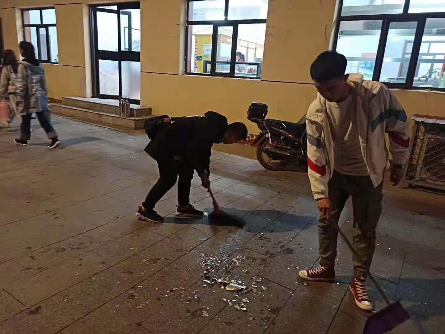 夜幕降临的时候,是同学们流动量最大的时候。忙碌了一天的同学们往往也选择在这个时间打水。殊不知,同学们手里提着的暖壶也存在着安全隐患,一个稍不留神就可能会炸裂。更有甚者可能会伤及到同学们。上周二的晚上有两位同学的暖壶不幸发生了炸裂,附近巡逻的校安协副会长郭政希等同学在确认过没有同学受伤后,找来了扫把和簸箕及时清理了现场,确保了来往同学能有一个安全的打水环境。 |