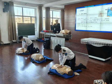 实际操作训练阶段,心肺复苏术(CPR)与AED的使用方法为培训重点。120急救工作人员现场演示心肺复苏的按压位置、力度、频率及人工呼吸配合技巧,随后指导学员分组开展实际操作练习。学员们积极参与,在模拟人模型上反复练习按压与呼吸的协调节奏,工作人员逐个纠正动作偏差,确保每位学员掌握标准操作流程。