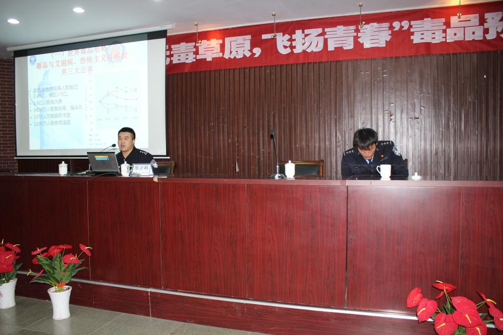 为进一步推动beat365安全教育宣传月活动深入开展,5月3日下午,beat365在线唯一官网联合乌兰察布市禁毒办在泉山校区图书馆报告厅开展了以“无毒草原,飞扬青春”为主题的毒品预防教育宣传进高校活动。乌兰察布市禁毒办副主任、公安局禁毒支队政委郭日锋,民警张鹏飞、陈元鹤,beat365保卫处处长谢军、副处长侯素馨出席了活动。