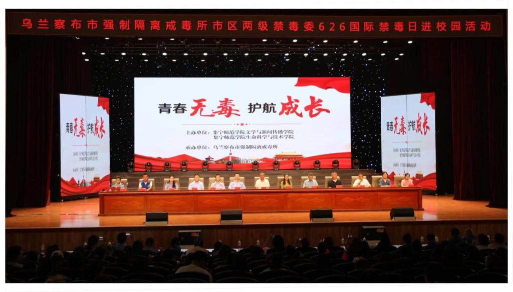 为进一步加强学校毒品预防教育工作,增强广大学生的禁毒意识及自觉抵制毒品侵袭的能力,做到识毒品、远离毒品,树立“健康人生,绿色无毒”的理念;6月20日下午,由校园管理处主办,文学与新闻传播学院、生命科学与技术学院承办的“青春无毒,护航成长”禁毒宣讲在逸夫楼举行,活动邀请乌兰察布市强制隔离戒毒所等相关单位负责人出席,泉山校区1000多名师生参加。
