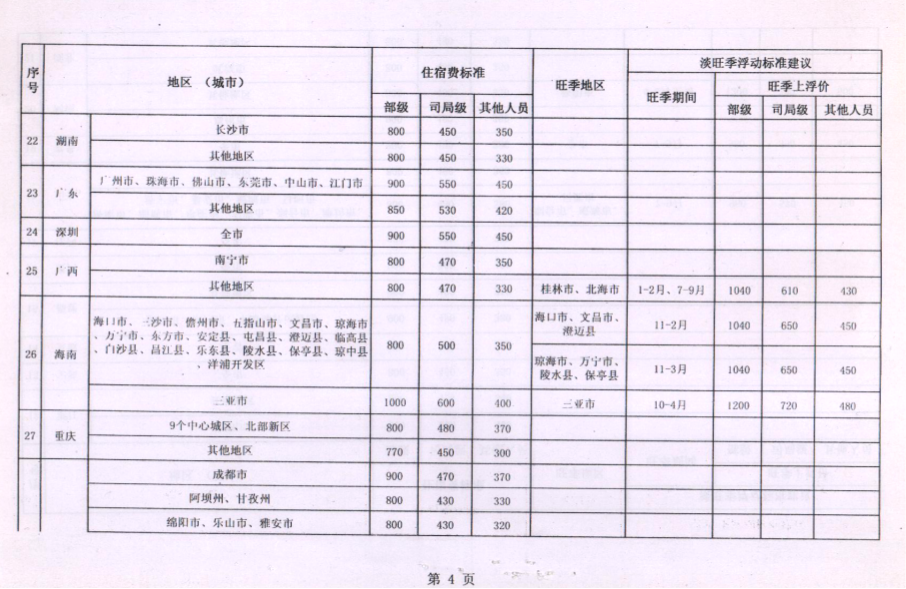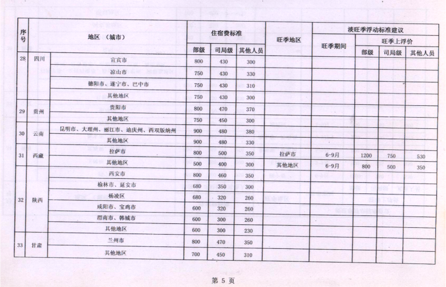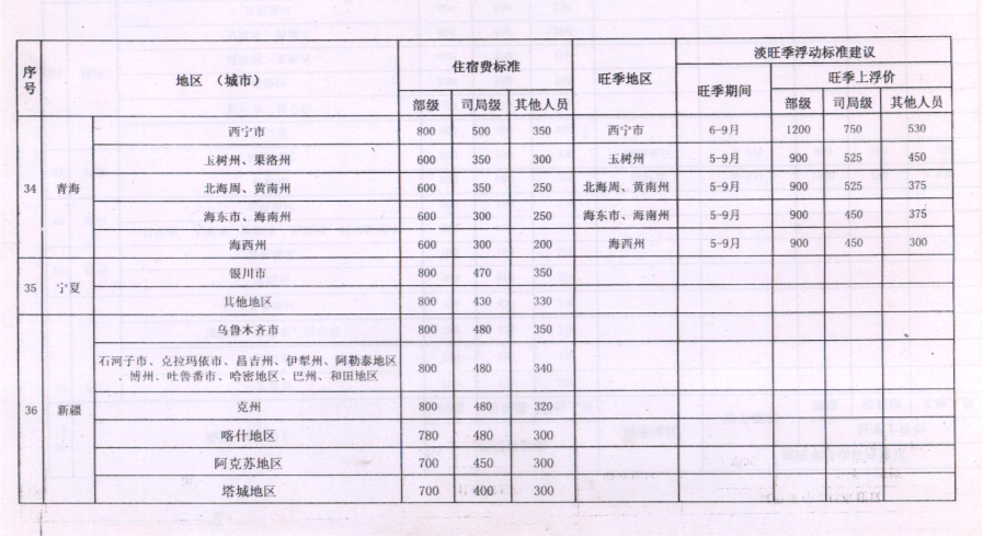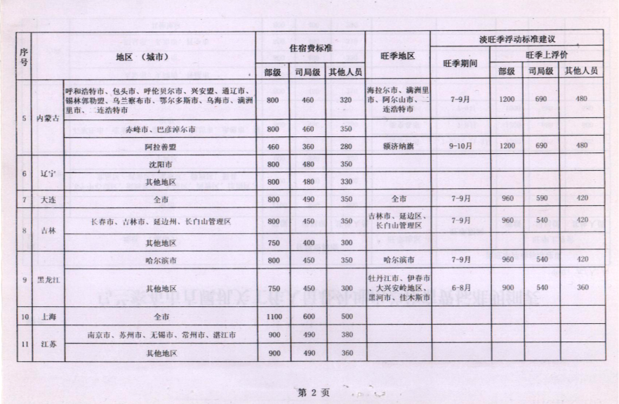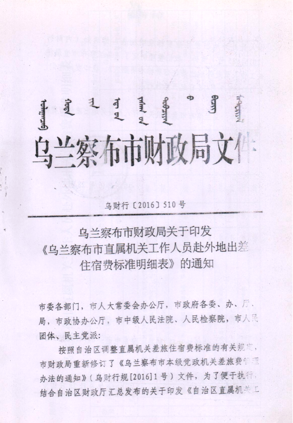 乌兰察布市直属机关工作人员赴外地出差住宿标准明细表