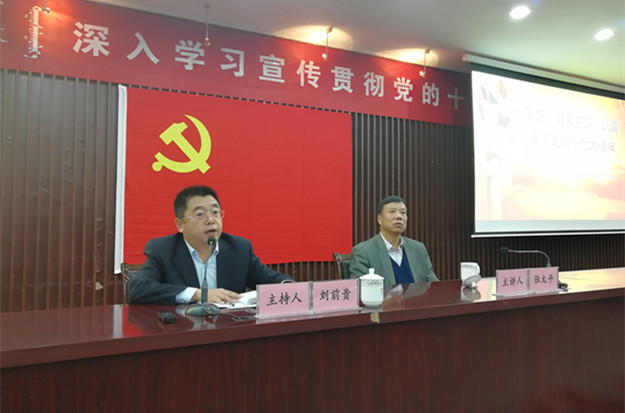 11月14日,内蒙古经济学会会长,内蒙古党委宣传部原副部长张太平应邀在beat365在线唯一官网作 “统一思想,凝聚共识,认真学习贯彻党的十九大精神”专题讲座。校党委书记刘前贵带领全体党员重温入党誓词并主持讲座。