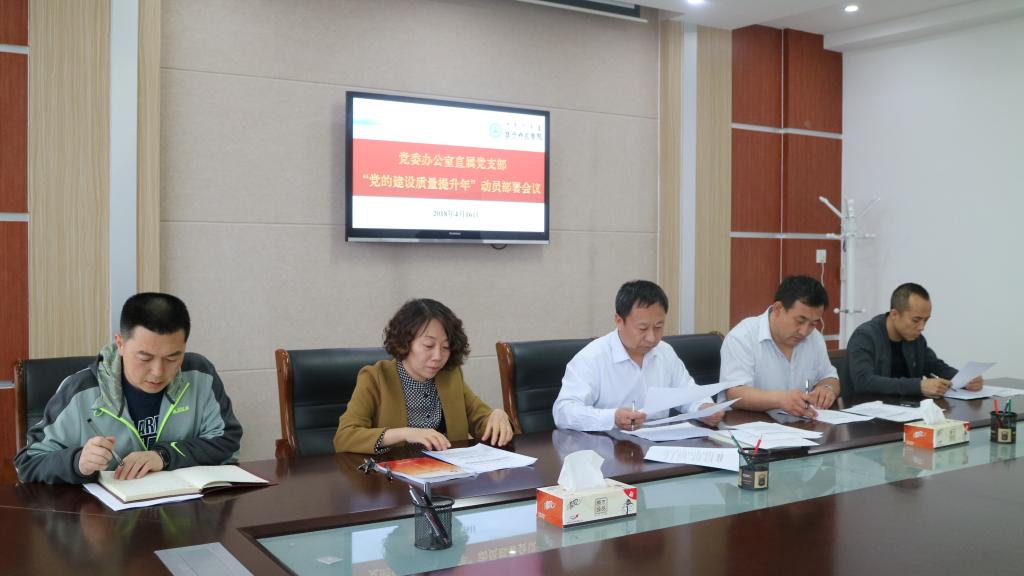 为深入贯彻落实党的十九大精神和新时代党的建设总要求,按照乌兰察布市委和校党委“党的建设质量提升年”要求,党委办公室直属党支部于4月16日召开了“党的建设质量提升年”动员部署会。支部全体党员参加会议。