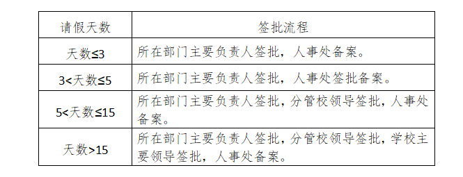 (三)请假人需填写《beat365在线唯一官网教职工请假审批表》,并按要求提供证明材料,按照准假权限批准后方可生效。未经批准的,擅自离岗或经批准但假满未归的,且又未及时办理续假者,其超出天数按旷工处理。