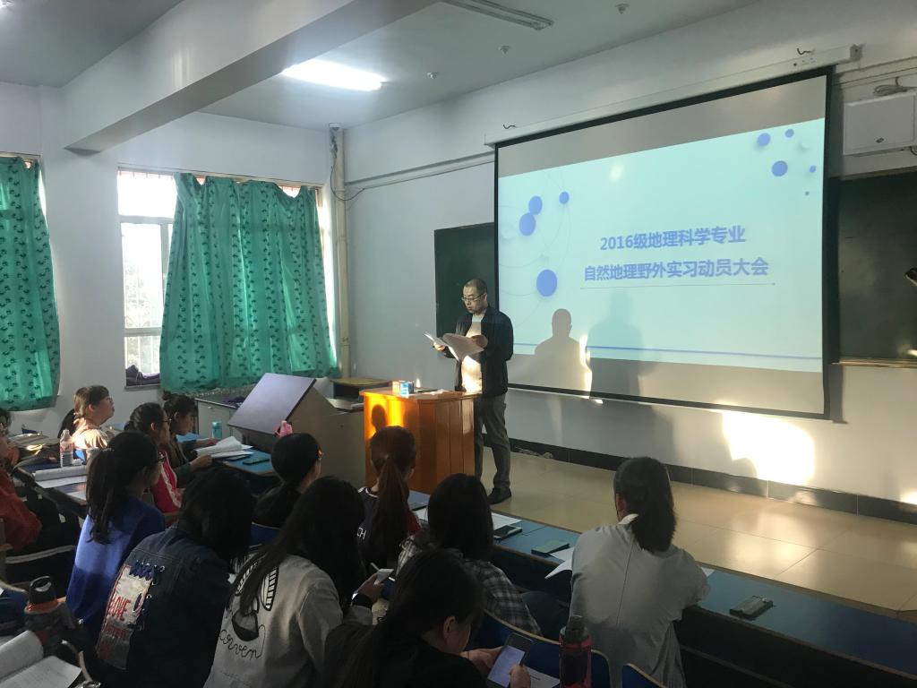 5月27日下午,地理科学学院在教学主楼119教室举行2016级地理科学专业学生野外实习动员大会。暴向平老师、班主任王腾老师及2016级地理科学1班、2班全体同学参加动员大会。会议由王腾主持。