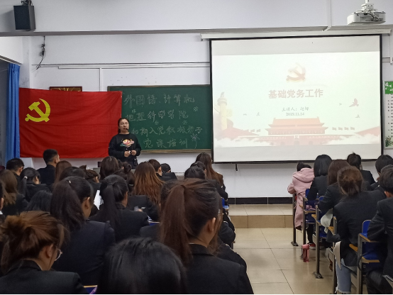 根据地理科学学院党总支“不忘初心、牢记使命”主题教育的统一部署,11月14日下午,学工党支部书记赵娜在主教楼119为入党积极分子、发展对象、预备党员解读了《基础党务工作》的专题党课。
