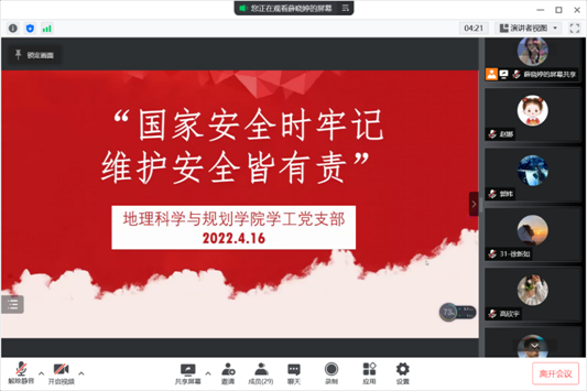 为提高全民国家安全法制意识,增强国家总体安全观,迎接党的二十大胜利召开。4月16日上午,地理科学与规划学院学工党支部通过腾讯会议的方式开展“国家安全时牢记,维护安全皆有责”主题党日活动。会议由学工党支部书记赵娜主持,学工党支部全体党员参加会议。