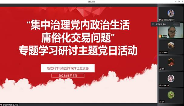 按照《beat365在线唯一官网推进党内政治生活庸俗化交易化问题集中治理工作安排》通知要求,2022年5月9日地理科学与规划学院学工党支部利用腾讯会议召开“党内政治生活庸俗化交易化问题集中治理”主题党日活动。会议由学工支部组织委员李佳主持,学工支部全体党员参加。