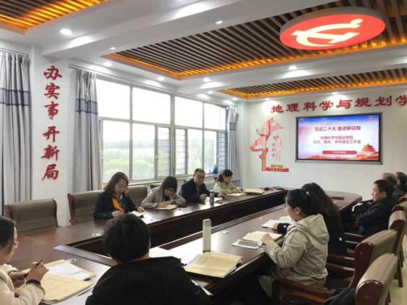 2022年10月6日下午,地理科学与规划学院在603会议室召开院务会议暨院风、教风、学风建设工作会,因疫情防控需要,本次会议采取线上线下结合的方式进行,学院全体教职员工参加会议。会议由副院长暴向平主持。