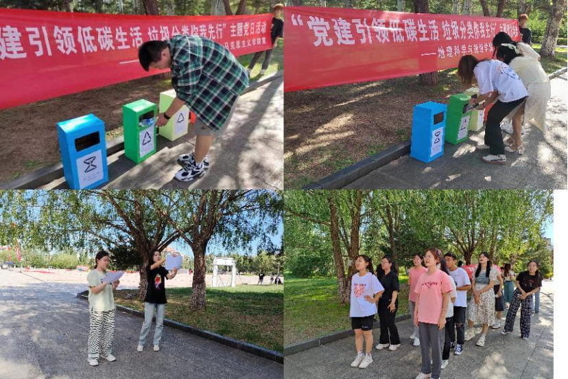 活动开始,地理科学与规划学院吴阳阳、任鑫美宣讲垃圾分类的小妙招,马克思主义学院张晓源、王锦婷介绍不同颜色垃圾箱的作用。随后,地理科学与规划学院郁卓霖、赵文青分享自己的环保理念和环保价值观,马克思主义学院韩颖、徐鑫发表观点并呼吁全体学生党员要把垃圾分类理念贯彻于心。活动最后,全体学生党员在校园中,进行实践分类垃圾的相关小游戏、将垃圾投入对应颜色的分类箱中、垃圾分类抢答等。