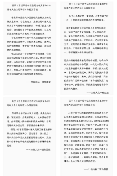 为纪念辛亥革命110周年,缅怀孙中山先生等辛亥革命先驱的历史功勋,学习和弘扬他们为振兴中华而矢志不渝的崇高精神,按照校团委工作要求和部署,地理科学与规划学院团总支于10月21日举办学习“习近平总书记在纪念辛亥革命110周年大会上的讲话”主题座谈会。