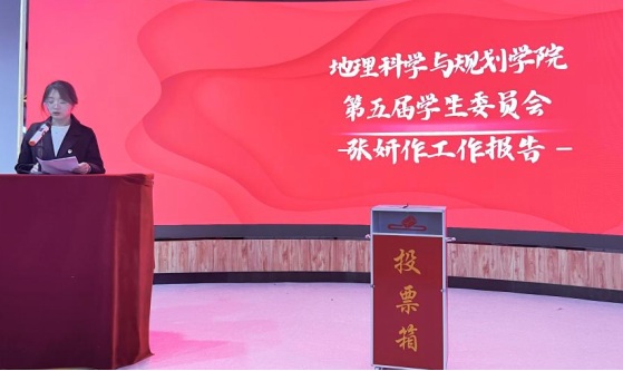 大会第二项,张妍同学代表地理科学与规划学院第五届学生委员会作工作报告。