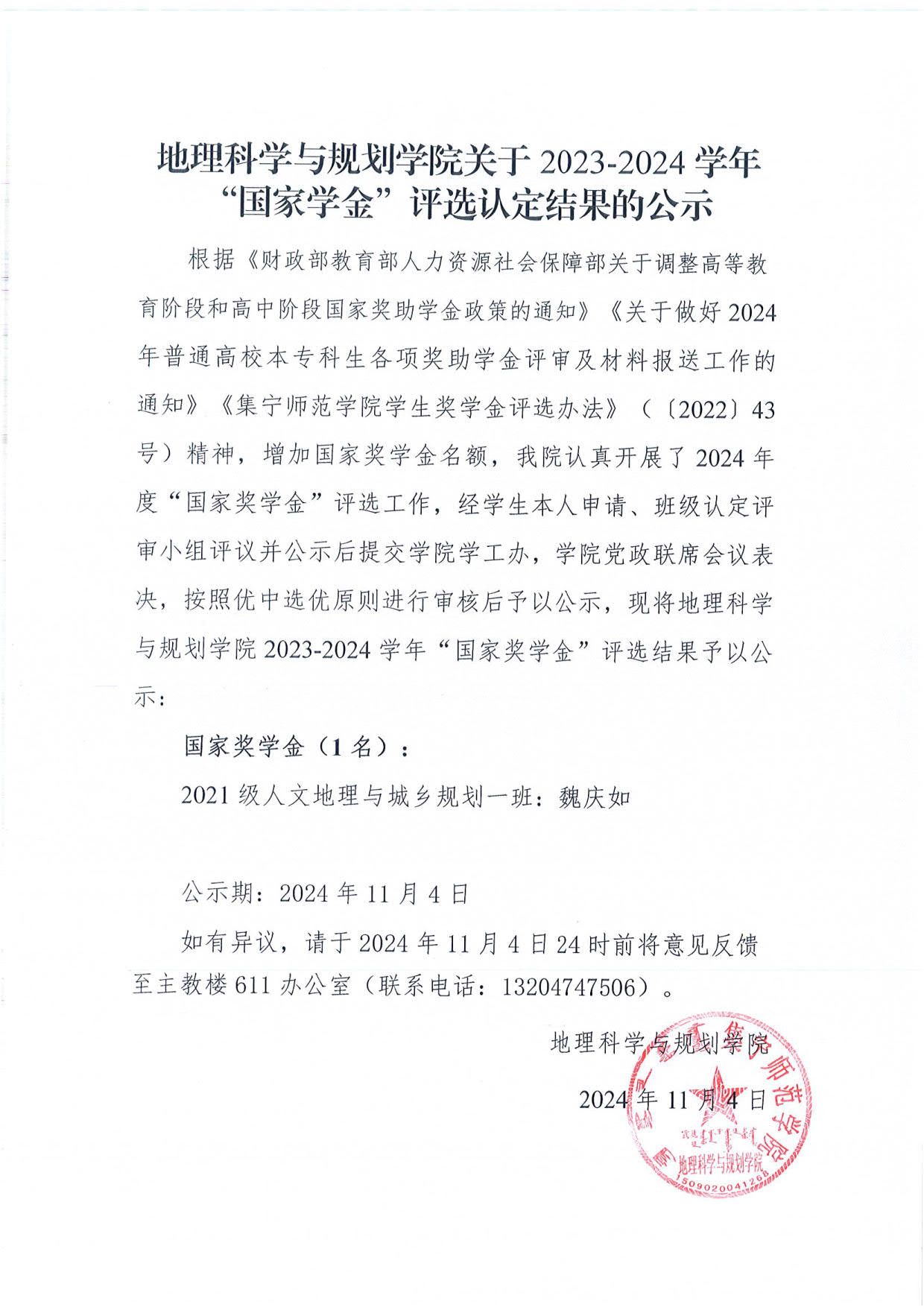 地理科学与规划学院关于2023-2024学年“国家奖学金”评选认定结果的公示