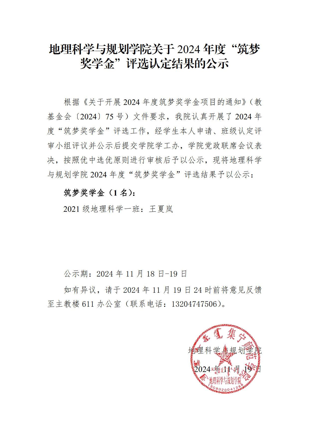 地理科学与规划学院关于2024年度“筑梦奖学金”评选认定结果的公示