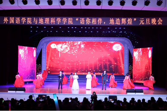 12月27日,由外国语学院联合地理科学学院举办的“语你相伴,地造辉煌”大型元旦晚会在逸夫楼报告厅如期上演。团市委书记李锴栋、校党委委员宣传部部长张富、校党委委员科技处处长李平、学生处处长兰立新、就业处处长刘国义、校团委书记李瑞俊、教务处处长姚玉阁、学生处副处长王飞出席晚会,外国语学院、地理科学学院的全体师生参加。