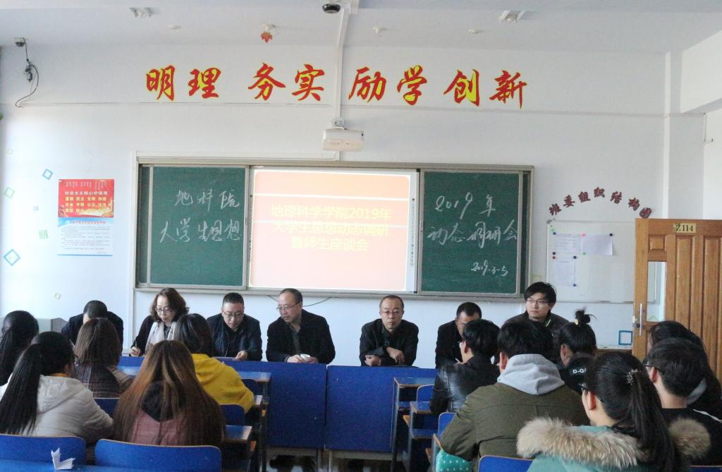 为及时、全面了解学生思想动态,有针对性地开展学生意识形态和思想政治教育工作,了解学生学习、生活、心理等方面的实际问题,3月5日下午地理科学学院在南主教楼114教室召开了2019年大学生思想动态调研座谈会。院长王培青,党总支副书记张强,黄倩老师以及班主任代表、学生代表近40人参加了座谈。