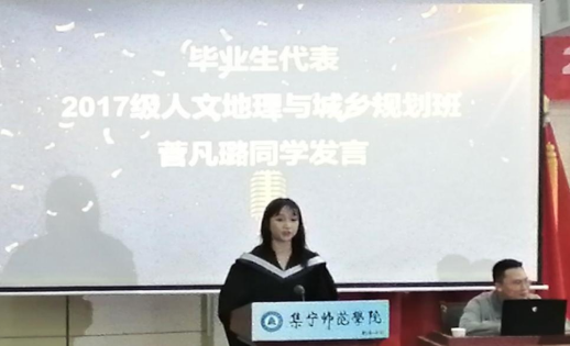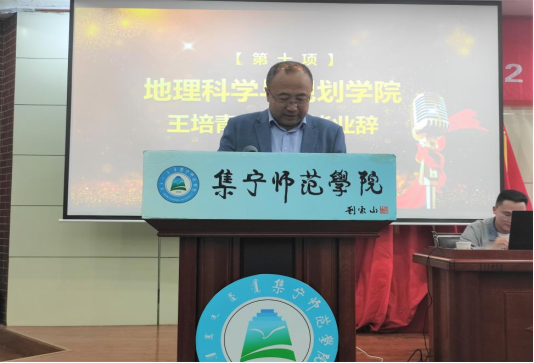 地理科学学院院长王培青致毕业辞。王培青代表地理科学学院全体师生对毕业生送上最热烈和最美好的祝愿。他对毕业生提出两点希望:希望做饮水思泉,懂得感恩的人;做对国家、社会有责任心的人。他说:母校将一直在这里,当你们重回这里的时候,母校愿意与你们分享喜悦分担风雨,学院永远是你们的精神家园。