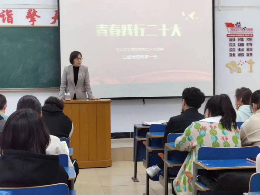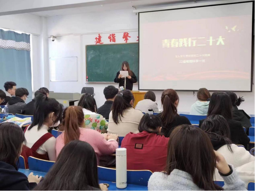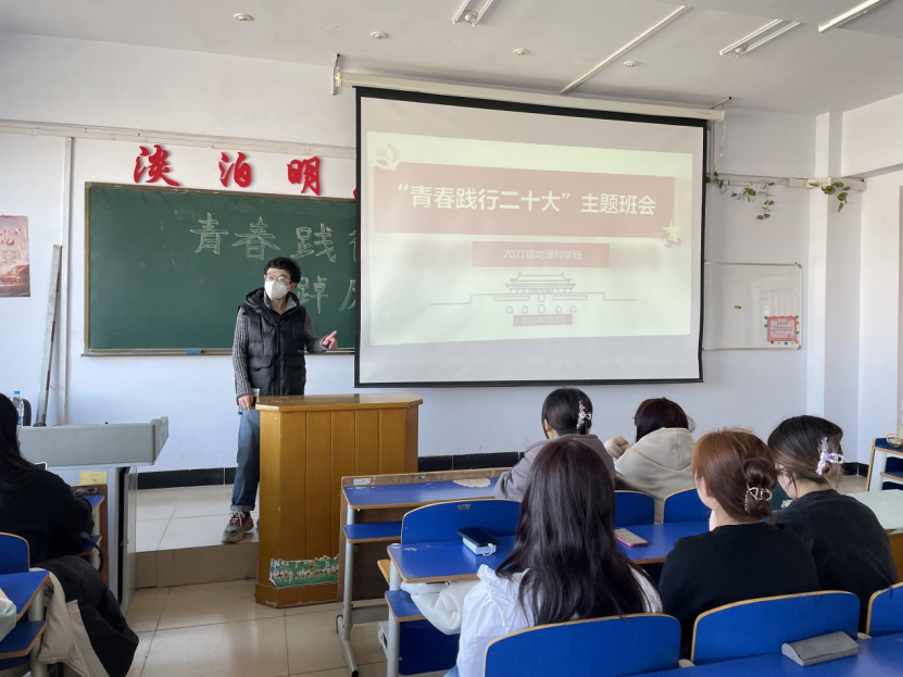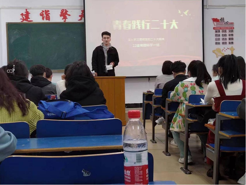 为深入学习宣传贯彻党的二十大精神,深刻领悟习近平总书记在二十大报告中对青年的深情寄语,从中汲取精神力量,坚定理想信念,厚植爱国情怀,以饱满的精神面貌投入到新学期的学习生活中,立志做有理想、敢担当、能吃苦、肯奋斗的新时代好青年,地理科学与规划学院于3月5日召开“感悟二十大,奋进新征程”主题班会。