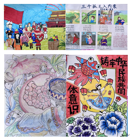 第三阶段:以“铸牢中华民族共同体意识”为主题开展的绘画比赛。同学们用富有想象力的笔墨勾勒出一幅幅精美的民族团结作品。