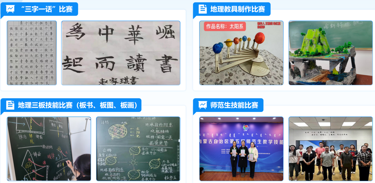 在课程实施过程中,开设地理知识组织与实践、地理制图综合实践、地理学科专题设计等实训课程,同时与“三字一话”比赛、“地理三板技能”(板书、板图、板画)比赛、地理教具制作比赛、师范生技能比赛等实践活动相结合,激发学生自主学习、自主实践的内生动力,促进了第一课堂与第二课堂的有效衔接,充分发挥了协同育人的功效。