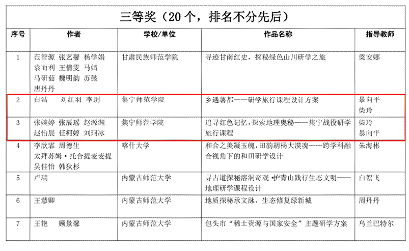 此次参赛不仅提升了我院学生的研学课程设计能力与团队协作水平,更激发了地理师范教育的创新活力。推动地理研学课程落地实施,既是全面推行素质教育、深化基础教育课程改革的关键手段,也是提升学科核心素养的有效途径。获奖成果不仅是对我院师范生研学课程设计能力的肯定,更彰显了学院在研学教育领域的持续探索与积极成效。