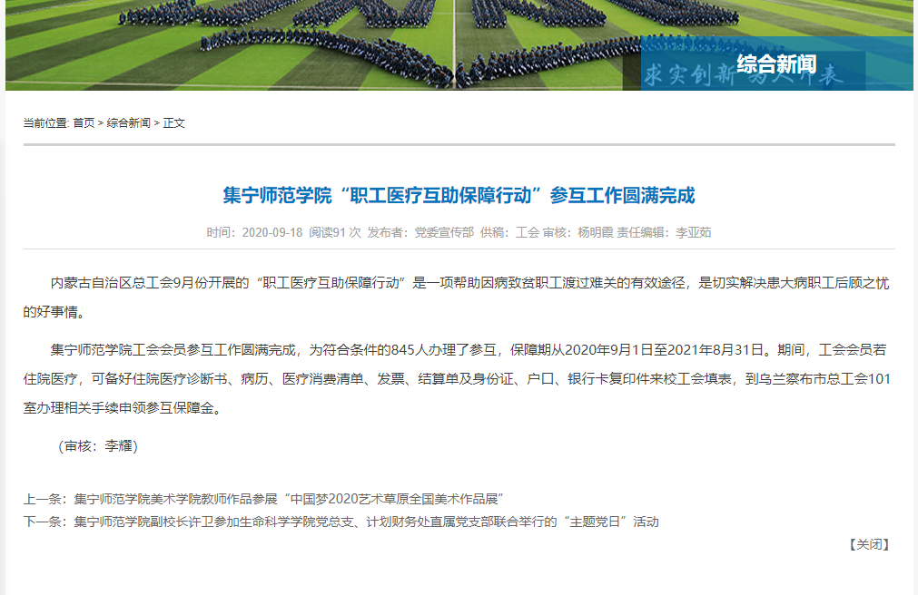 转发乌兰察布市总工会乌总办发【2020】18号《关于开展 2020 年度职工医疗互助保障行动的通知》原文,请2020年9月1日后发生住院医疗的教职工根据文件提交材料信息,办理相关报销手续。