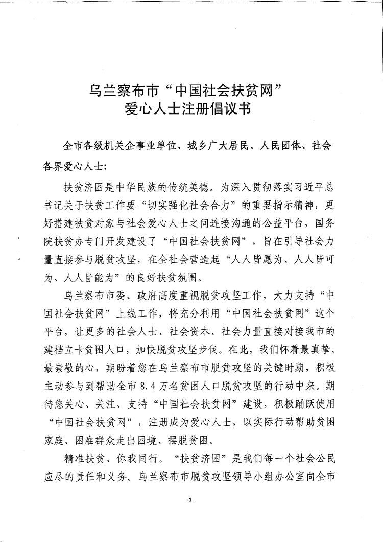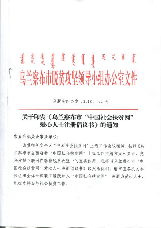 附件:1、关于印发《乌兰察布市“中国社会扶贫网”爱心人士注册倡议书》的通知