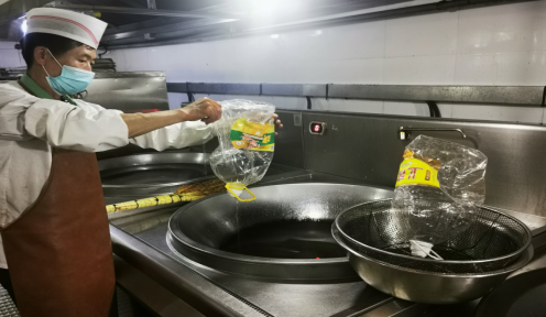 学校例如对用完的食用油桶,要求食材管理人员要把油桶倒立一段时间,让每一滴油充分使用,对有些蔬菜的根茎和叶子,如果能分类加工的,例如芹菜,芹菜叶摘洗干净后制作馅儿,西蓝花茎制作成馅,炸成蔬菜丸子等,让每一种食材都物尽其用。