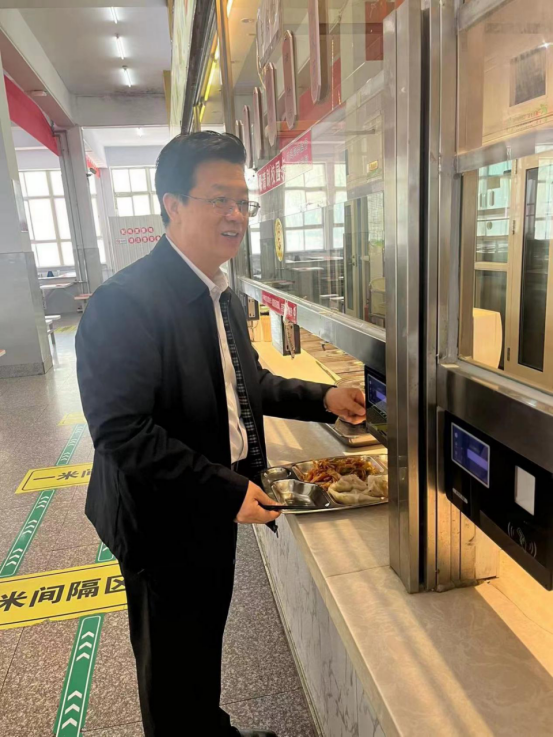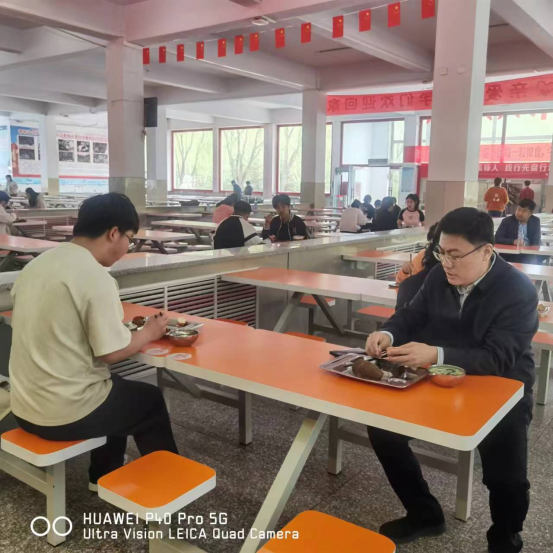 拓俊杰在与学生共同就餐时候,详细询问学生对食堂饭菜种类、质量、口味、价格、服务等方面的需求,征询学生对餐饮服务保障的意见。