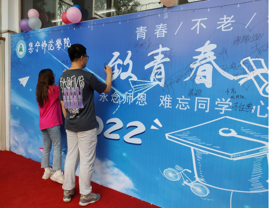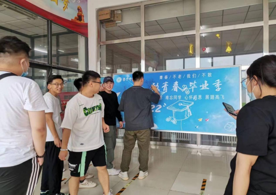 餐饮服务中心在餐厅楼前精心制作了条幅,欢送毕业生。大屏上播放欢迎语、安排专人在现场管理值班台,引导学生就餐。