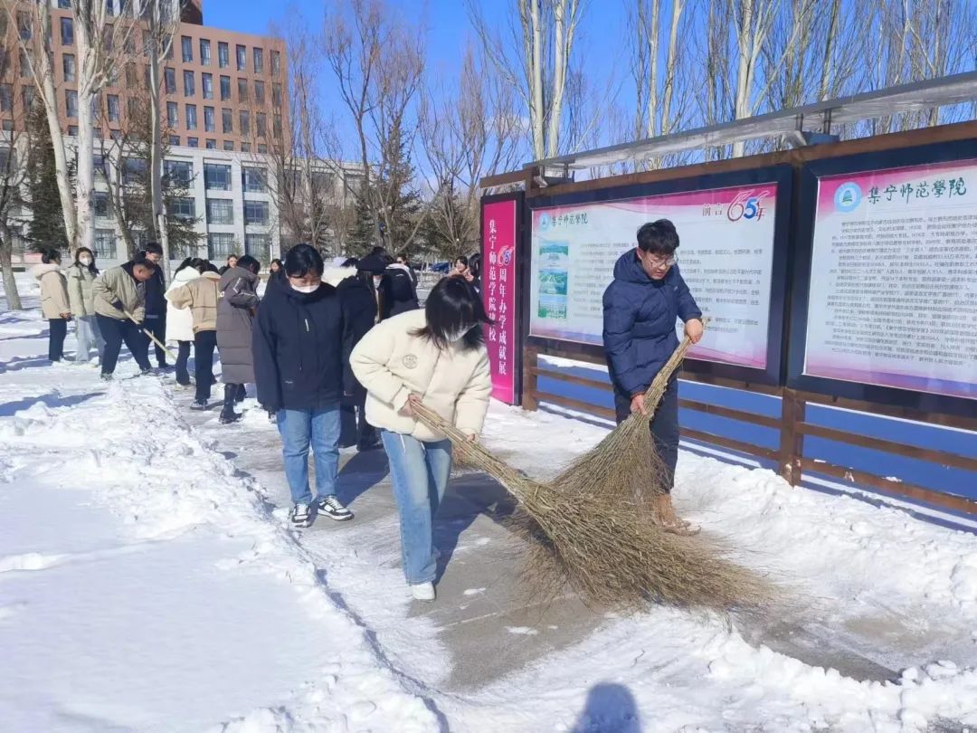 凛冽的寒风中,全体学生支部党员拿着铁锹、除扫铲、扫帚等工具,铲的铲、扫的扫,大家分工有序、配合默契、干劲十足,对逸夫楼前通往主教楼、网教楼以及主教楼通往行政楼的道路积雪进行清扫,一个个忙碌的身影形成了雪天里一道靓丽的风景线,劳动的热情和团结的力量温暖了整个冬日。