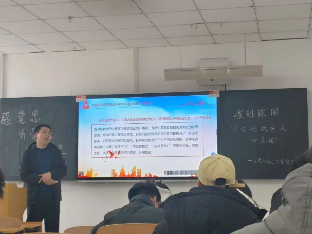 宣讲会上,党总支副书记李强系统阐释了“六句话”的深刻内涵,强调内蒙古作为中国共产党最早建立党组织的民族地区,始终在党中央的领导下发展壮大。并结合内蒙古工业发展历程,如“一五”时期包钢等重点项目的建设成就,生动展现了党中央对边疆地区的支持与关怀。通过“三千孤儿入内蒙”“最好的牧场为航天”等民族团结故事,深刻诠释了“模范自治区”的示范意义,号召师生将铸牢中华民族共同体意识融入学习和工作中。 活动通过主题宣讲、案例分析和互动研讨等形式展开,以PPT讲解、历史影像展示等多媒体手段增强感染力。学生代表在交流中表示,宣讲内容将党的理论与专业实践紧密结合,激励大家将个人成长融入国家战略需求,立足岗位践行初心使命。
