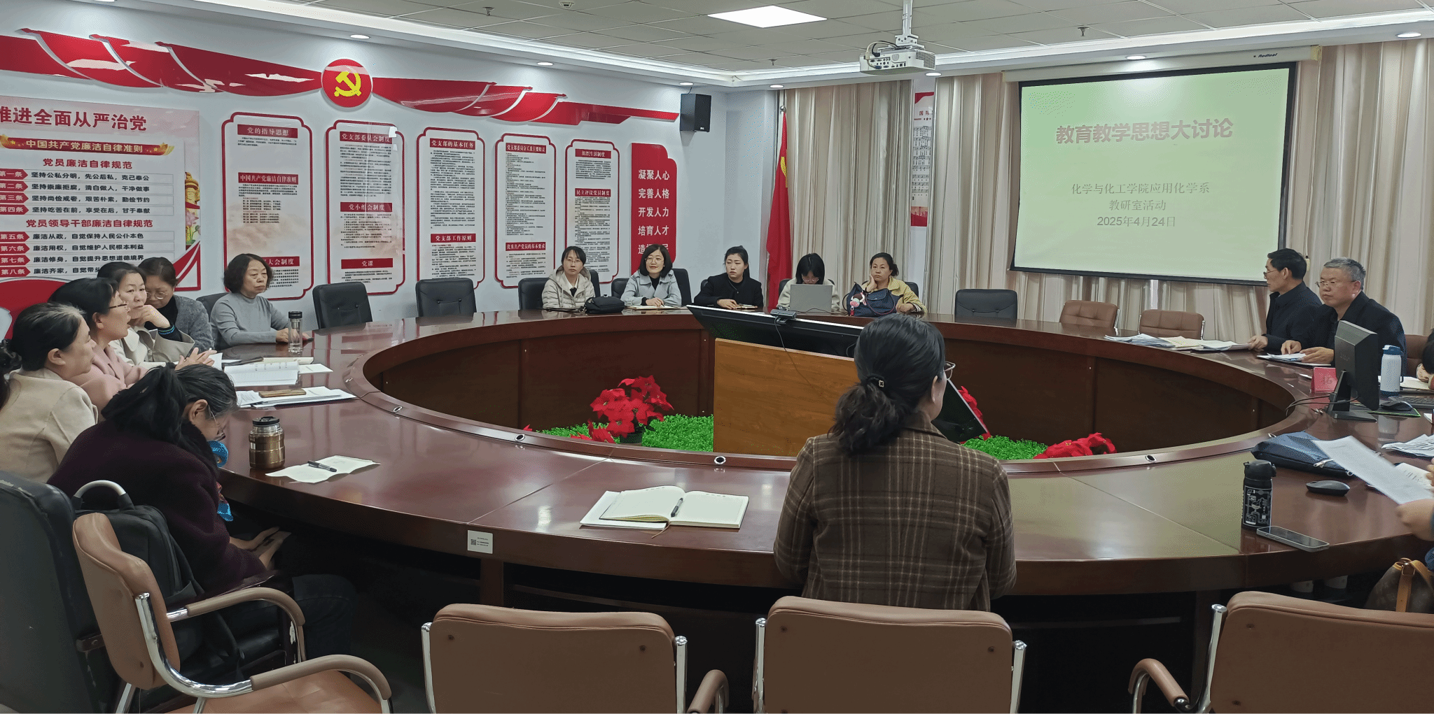 为深入贯彻落实学校教育教学改革要求,2025年4月24日化学与化工学院应用化学系组织教师进行“教育教学思想大讨论”教研活动,学习领会《教育强国建设规划纲要(2024-2035年)》文件精神,聚焦教育综合改革,更新教育教学观念,理解学科发展前沿,不断改进教学方法和手段,促进产教融合和校企合作,开展智慧课程建设,改善教学效果,提升教学质量。