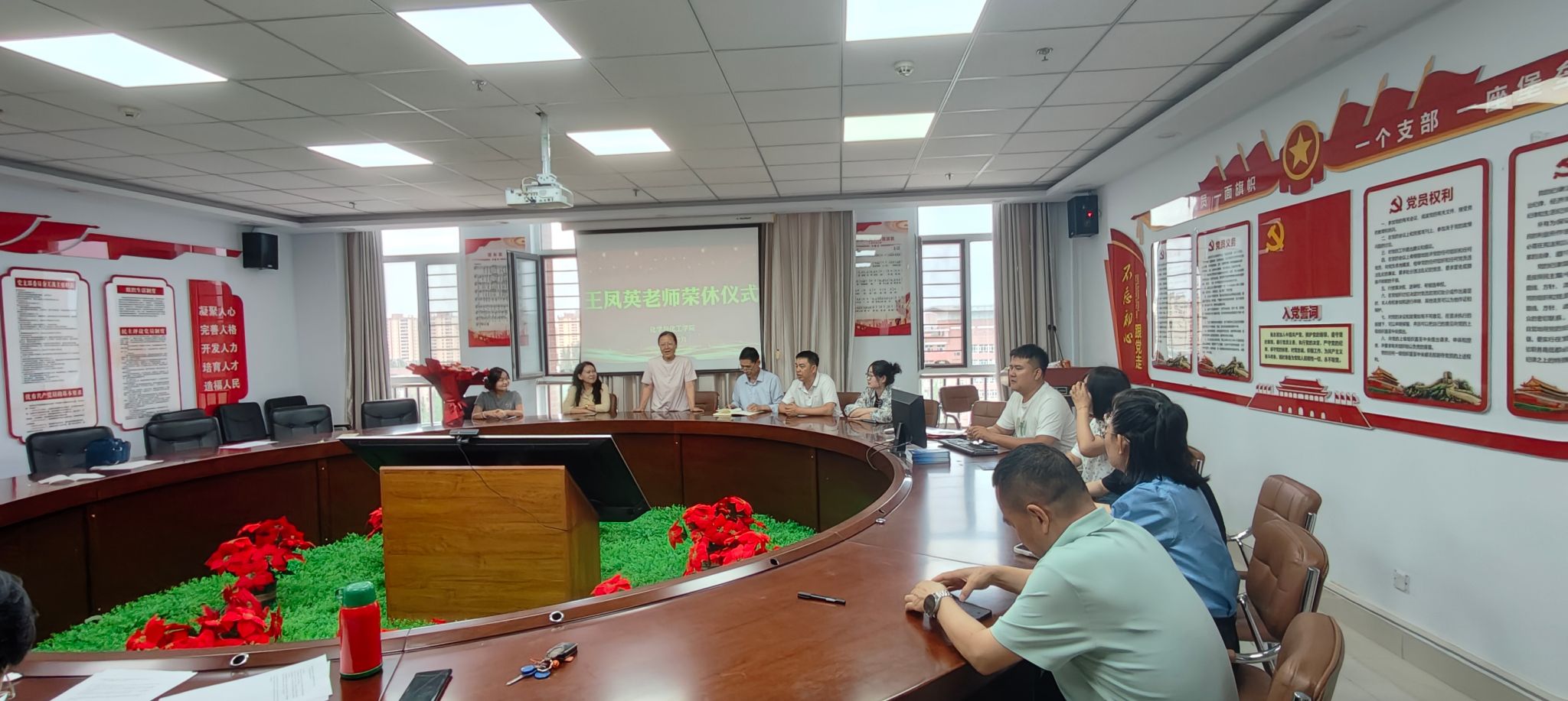 离退休人员工作处巩立红为王老师颁发荣誉证书和纪念品,敬献鲜花,参会教师与王凤英老师合影留念。