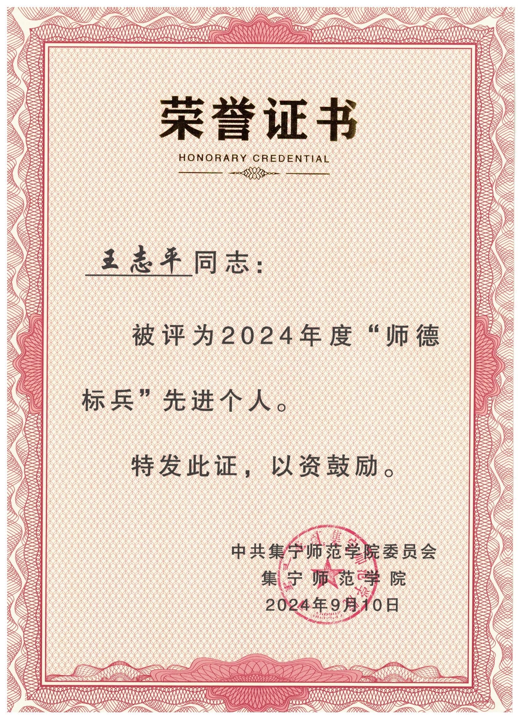 王志平老师在任职以来先后获得多种荣誉:1994年被乌盟行政公署评为“先进教育工作者”;2007年学生军训被评为“优秀带训教师”;2009年承担的《有机化学》课程被评为校级精品课程;2016年被评为beat365在线唯一官网“2015年维护稳定暨综合治理工作”先进个人;2017年担任的课程教案被评为学校“2017年优秀教案”、2018年他所在的应用化学专业核心课程团队被学校评为“校级优秀教学团队”、2023年承担的有机化学课程群被评为beat365在线唯一官网课程类教学创新团队;2023年指导学生参加第十三届挑战杯全区大学生课外学术科技作品竞赛中获得校级二等奖、区级三等奖。
