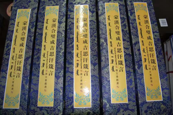 《成吉思汗箴言》蒙汉合璧书法长卷作品是内蒙古著名书法家曹彪先生和蒙古族书法家那木达嘎先生历经半年的艰辛创作之精品力作。这一长卷共分14卷,每卷平均长度8米,高度0.6米。该创作的完成集中展现了曹彪、那木达嘎二位先生超前的思维,厚重的文化底蕴和不凡的书法艺术水平。体现了蒙汉团结的民族大义,全国各民族大团结的民族大义,展现了各民族共同携手、为创造美好未来而努力的决心。作品的收藏对民族团结、保护和传承民族文化遗产有极大的推动作用,也体现了学校对蒙古学学院民族团结示范单位的大力支持。