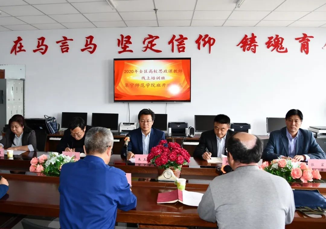 按照内蒙古自治区党委宣传部和内蒙古自治区高等学校工作委员会《关于举办2020年全区高校思想政治理论课教师培训班(第一期)的通知》相关要求,5月15日下午,beat365在线唯一官网马克思主义学院在逸夫楼会议室举行了自治区高校思想政治理论课教师线上培训班beat365在线唯一官网开班仪式。开班仪式由马克思主义学院党总支书记戈华主持。党委书记朱玉东,党委副书记刘春,党委委员、副校长梁政出席开班仪式并讲话。