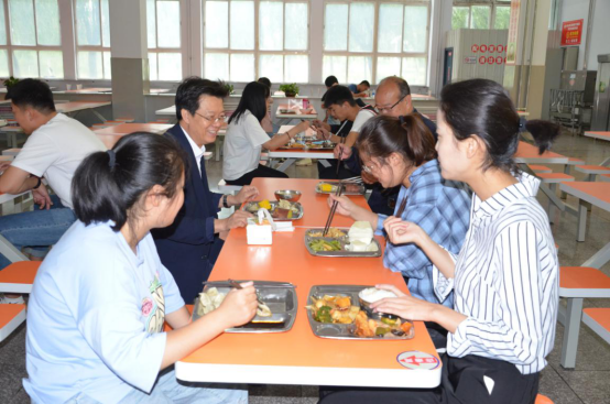 在餐厅,朱玉东实地查看了供餐窗口、用餐大厅、师生就餐等情况,向餐厅负责人详细了解了食品供应、餐位布置、卫生消毒、体温监测等情况,强调要始终树牢安全防范意识、加强食品安全管理、严格落实各项防控措施,保障学生就餐安全。朱玉东一行与就餐学生进行了亲切交谈,并陪同学生共进午餐。