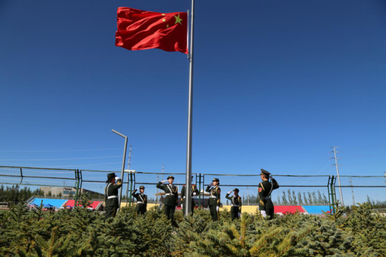 开训仪式在庄严的升旗仪式中开始,全体人员肃然向国旗行注目礼。