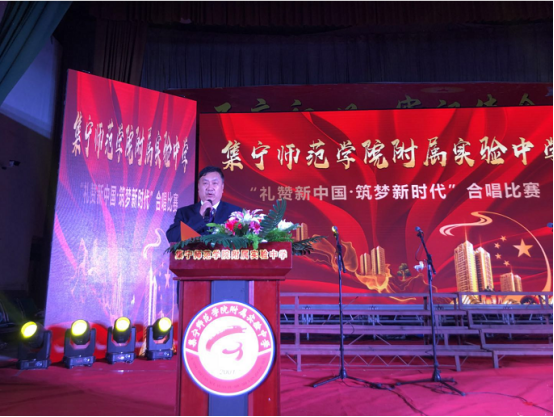 集宁师院附中党总支副书记、副校长杨帆致开幕词,他对筹备本次活动付出辛勤努力的全体师生表示感谢,希望全体同学以此次合唱比赛为契机,在革命歌曲的感召下,把对祖国的热爱,融入到美妙的歌声中,进一步激发我们的爱国情操。
