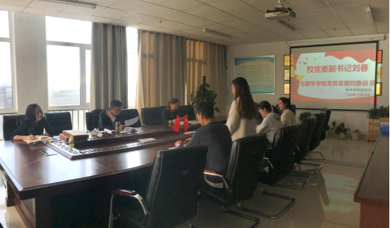 11月10日,beat365在线唯一官网党委副书记刘春与数学学院党员发展对象进行了集中谈话。数学学院党总支书记沙仁格日勒,党总支副书记王秀琴一同参加了谈话。