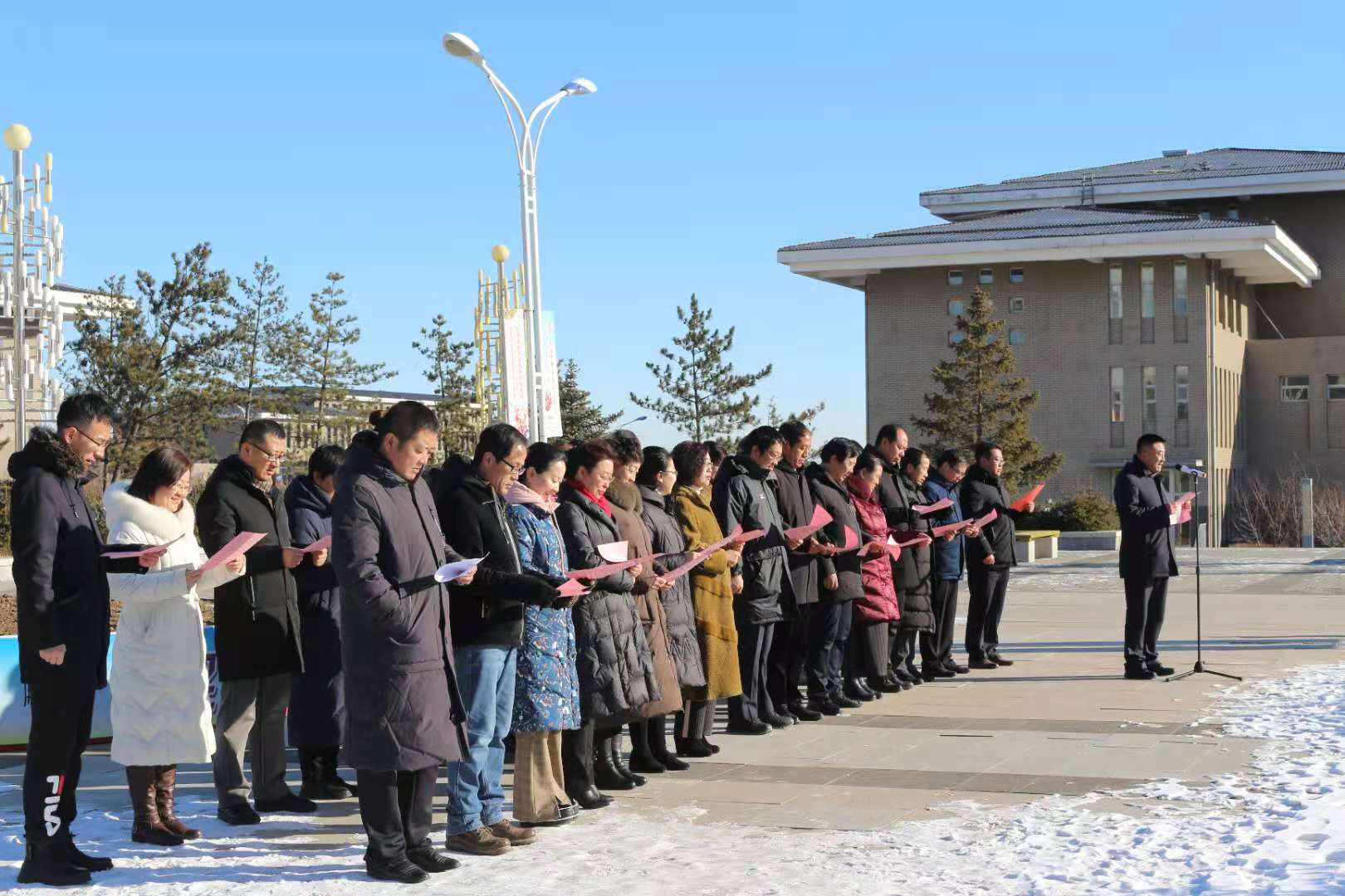 升旗仪式结束后,刘春和许卫分别在白海校区和泉山校区领读宪法部分内容,在场全体师生跟读。