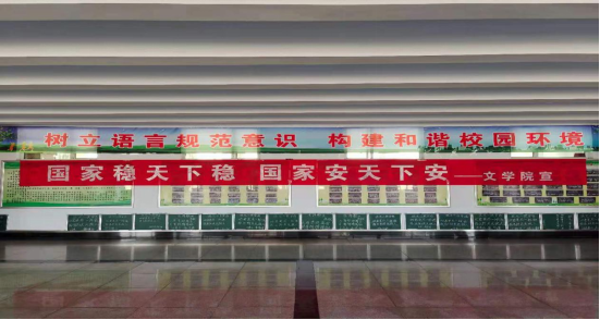 今年全民国家安全教育日宣传主题为“践行总体国家安全观,统筹发展和安全,统筹传统安全和非传统安全,营造庆祝建党100周年的良好氛围”。文学与新闻传播学院结合学院特色和疫情防控常态化形势,通过悬挂国家安全知识横幅、利用LED屏播放国家安全知识、组织开展“主题班会、团日活动”、号召全院学生进行网上国家安全知识竞赛等形式进行了国家安全知识宣传教育。