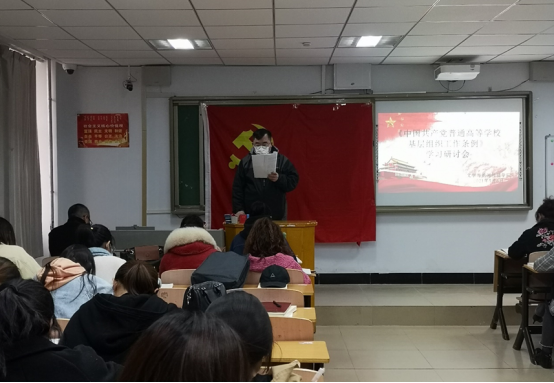 会上,张一弘传达了学校关于学习《中国共产党普通高等学校基层组织工作条例》相关文件精神,并向大家介绍了本次学习的主要内容和学习目的。文学与新闻传播学院教师党员郝青山带领全体党员学习了《中国共产党普通高等学校基层组织工作条例》的全部内容。
